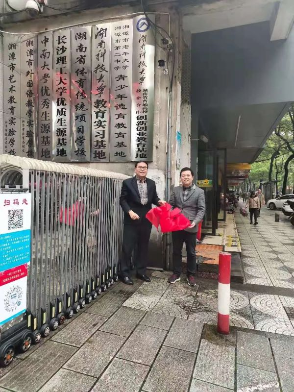 在二中门口,聂志军教授与唐新球董事长代表双方喜揭红绸,共同完成揭牌仪式,湘潭市二中正式成为“古天乐代言太阳集团老员工创新创业基地”。这是一次公司与二中融通融合,创新发展的良好契机,将开启双方友好往来、通力合作的新篇章。