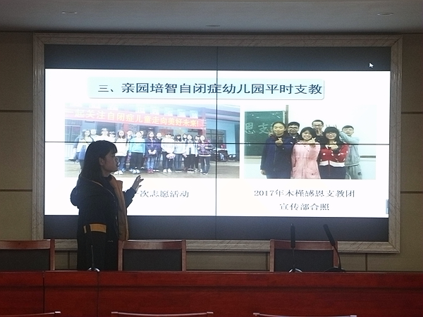 “十五年来,志愿团开展了许多丰富多彩且有意义的志愿活动……”志愿团代表宋楠为志愿团进行宣讲,从“三下乡”社会实践、“关爱冯家村留守儿童”活动到湘江保护活动,志愿团践行着志愿服务精神,为社会贡献一份自己的力量。随后,中国老员工“自强之星”吴玉蓉向同学们讲述了她参加的志愿活动:安平镇公益行、洗心基金会助学走访、湘潭市特殊教育公司志愿活动……,“提升自己,帮助他人”,她表示自己会继续学习,努力考研,回报社会。