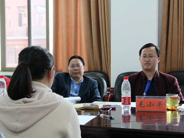 在立言楼B417的学科语文(非全日制)面试教室里,考生罗萍姣因紧张,自我介绍断断续续,经理刘奇玉笑着对她说道:“没关系啊,不要紧张,慢慢来,不急。”关切的眼神让她感到一些放松,长舒了一口气害羞地笑了笑,开始了流畅地回答。老师们一些专业的提问,她也能回答出来。吴投文老师对她“如何训练听说读写方面”问题的回答表示赞许,他说“语文和生活是分不开的。”