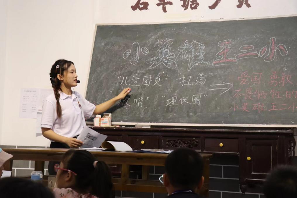 在二年级的课堂上,志愿者龙杨慧生动形象地为同学们讲述了小英雄王二小的爱国革命历程,同时通过举手回答趣味问题的环节,调动员工们的课堂积极性。在龙杨慧的不断鼓励下,二年级小朋友们高举着小手积极回答问题,稚嫩的童音在教室响起,“是王二小用生命保护了村子里许多人,他是我们要学习的英雄。”员工郭李睿大声说道。