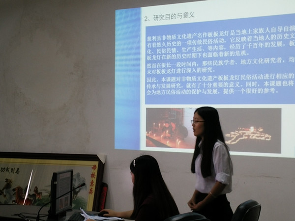 在介绍课题概况后,项目人郑文静对慈利县土家族传统文化活动“板板龙灯”的继承与保护进行了总体概述,详细阐述了其中存在的问题。胡铁强老师建议项目小组最好再对这一活动的文化起源做进一步调查,弄清“板板龙灯”整个历史发展传承过程。他鼓励小组向当地政府提出建立生态文化博物馆的建议,让“板板龙灯”的文化内涵保存更为完整。