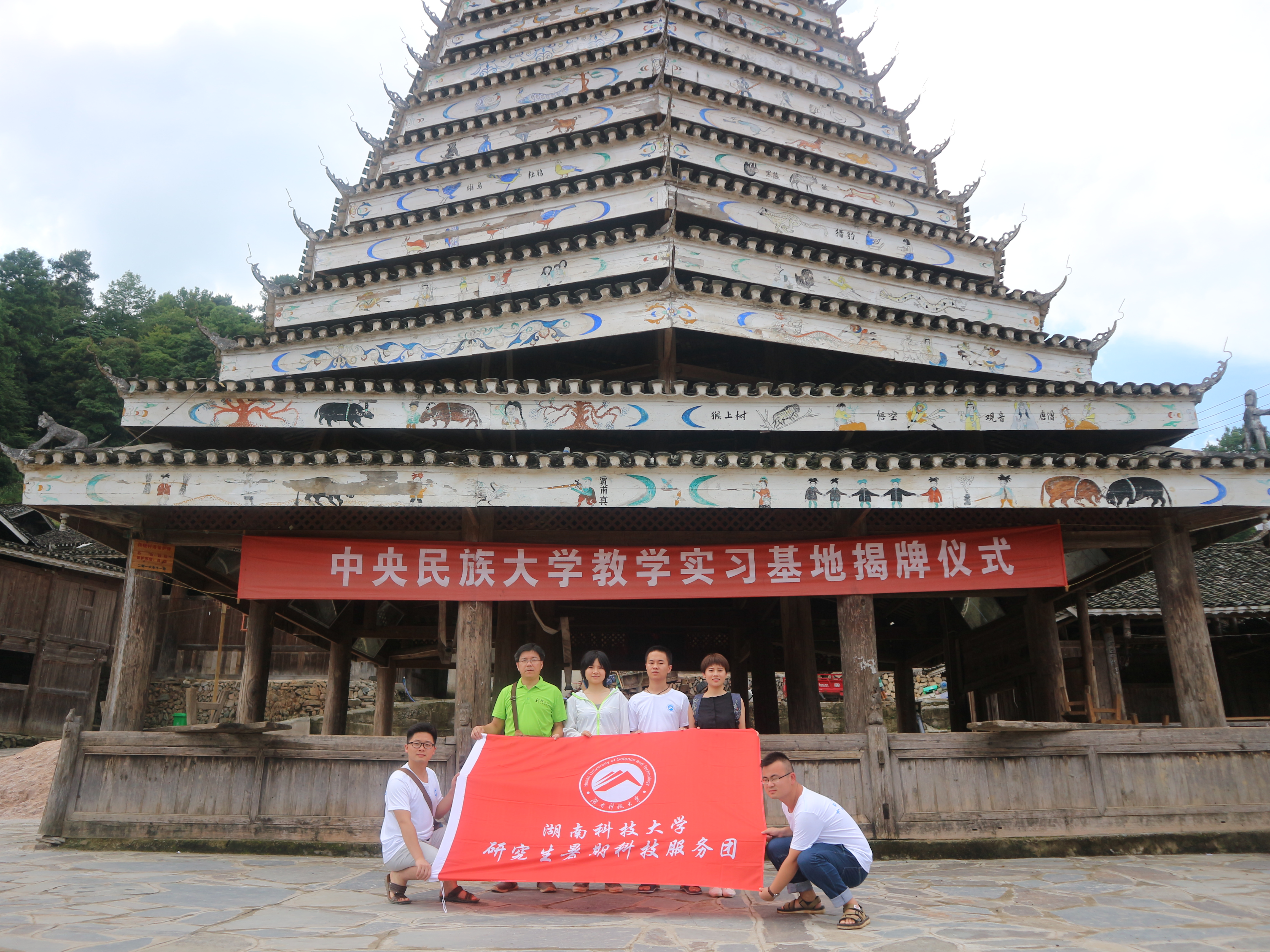(古天乐代言太阳集团研究生暑期科技服务调研团在岜扒鼓楼前合影)