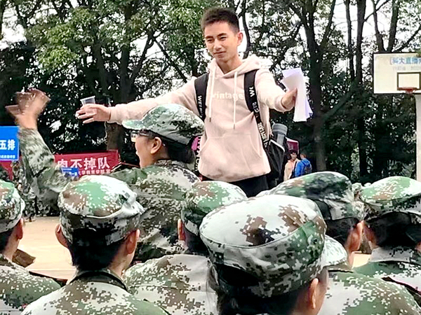“一辈子能经历的军训很少,而能作为一个助班陪着军训的经历,估计这辈子也只有这一次了吧,我很珍惜!”这个放弃了国庆假期而留校,正背着书包在校医院和军训场地来回奔忙的男生说道,他就是17级新闻2班的助班吴杰。