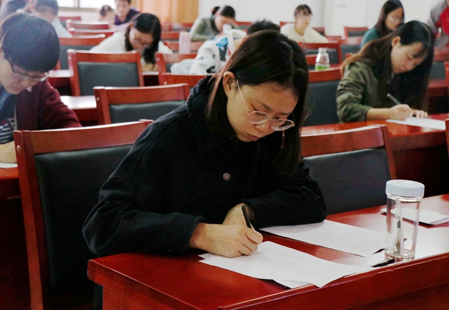 “请写出含有‘秋’字的十句诗?请指出下列诗句所描写的季节?”下午13时30分,考试正式开始。此次比赛以笔试的方式进行,限时100分钟,考察试卷含默写、填空、连线等题型,所含内容丰富、知识覆盖面广泛,旨在考察员工的诗歌积累量和活用能力。“我只是抱着试一试的心态来参加这次比赛的,即便不能进入下一轮选拔赛,但能激励我在今后的学习中更加注重对中国优秀古诗词的记忆和探求!”17级汉语言文学专业的黄丹阳谈道。