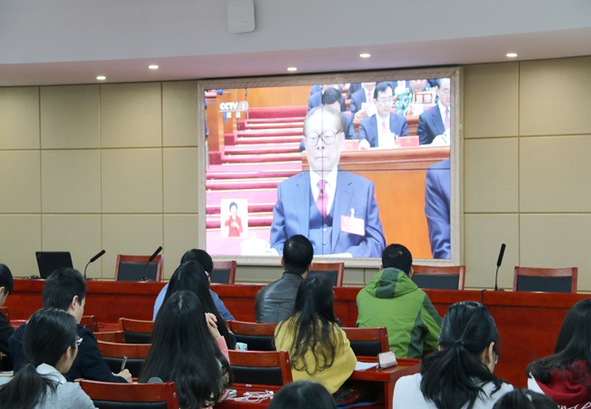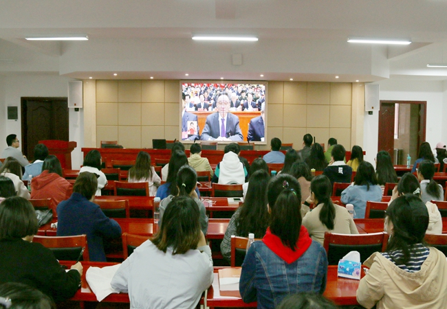 “中国特色社会主义进入新时代,意味着近代以来久经磨难的中华民族迎来了站起来、富起来到强起来的伟大飞跃,迎来了实现中华民族伟大复兴的光明前景”,师生们聚精会神地聆听习近平总书记代表十八届中央委员会,向大会所作的主题为《不忘初心,牢记使命,高举中国特色社会主义伟大旗帜,决胜全面建成小康社会,夺取新时期中国特色社会主义伟大旗帜,为实现中华民族伟大复兴的中国梦不邂奋斗》的报告。观看直播过程中,师生们不时在笔记本上做着记录,认真学习报告精神。