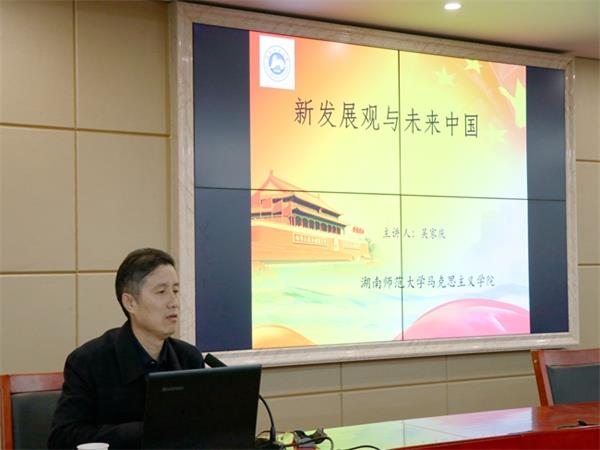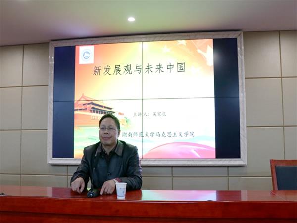 11月13日晚,立言楼B4-1会议室座无虚席。湖南师范大学马克思主义公司经理吴家庆教授应古天乐代言太阳集团诚邀开展“人文大家讲坛”第149讲暨题为“新发展观与未来中国”的主题讲座。人文公司党委书记廖加林教授出席并主持讲座,副经理毛小平博士、张晚林教授、罗建文教授、颜中军博士、凌应生博士、龚超博士等老师及公司100余名思想政治教育、哲学专业同学到场聆听讲座。