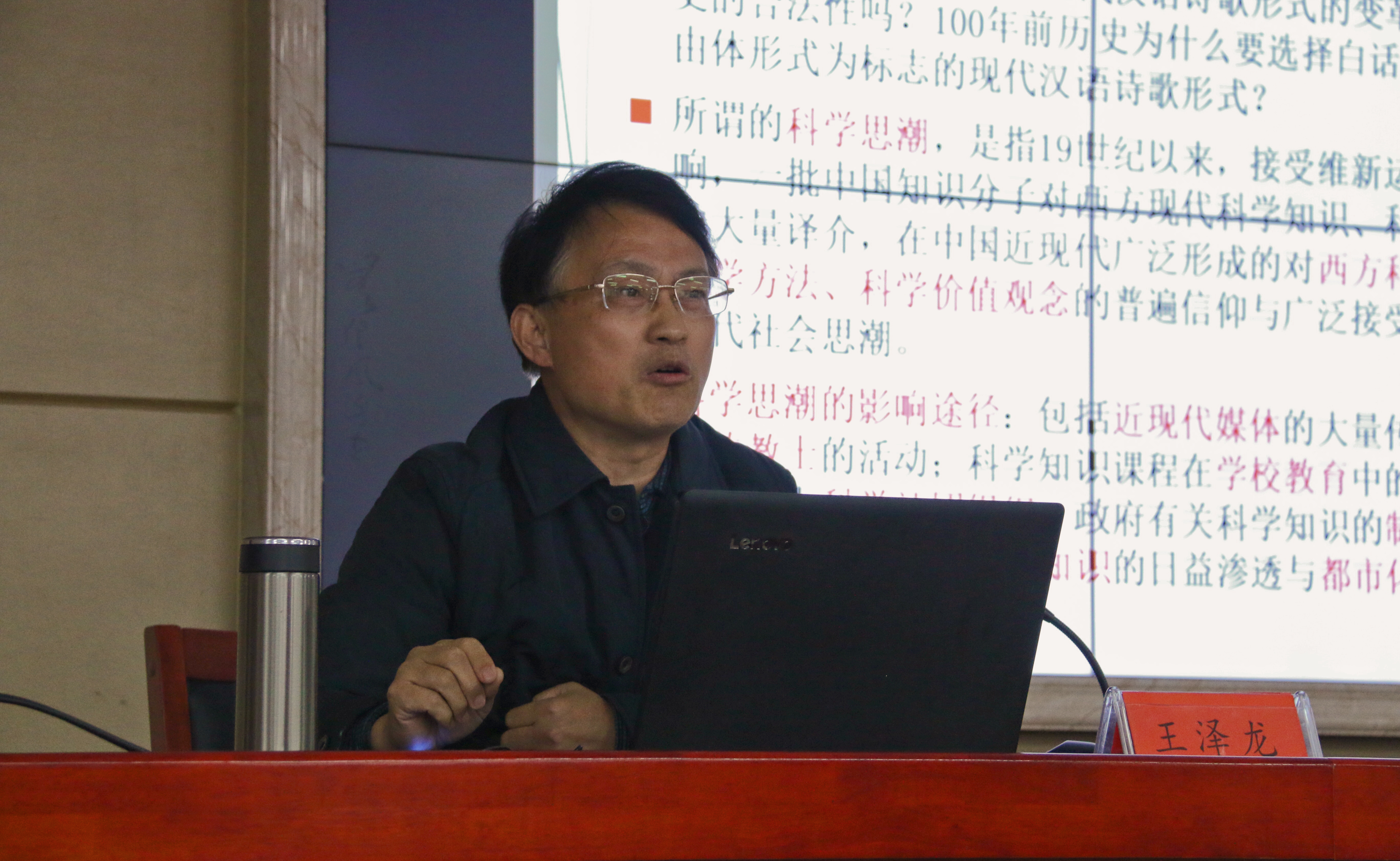 讲座现场座无虚席,王泽龙教授首先提出了“中国现代汉语诗歌形式的变革历史有合法性吗?一百年前历史为什么选择白话文、自由体形式为标志的现代汉语诗歌形式?”的问题,引起听众的思考。对此,王教授给出了自己的回答:中国现代汉语诗歌形式的变革,科学思潮的影响是一个极为重要的因素。本次讲座,王教授将自己经过多年思考,研究得出的结论,与大家进行交流。