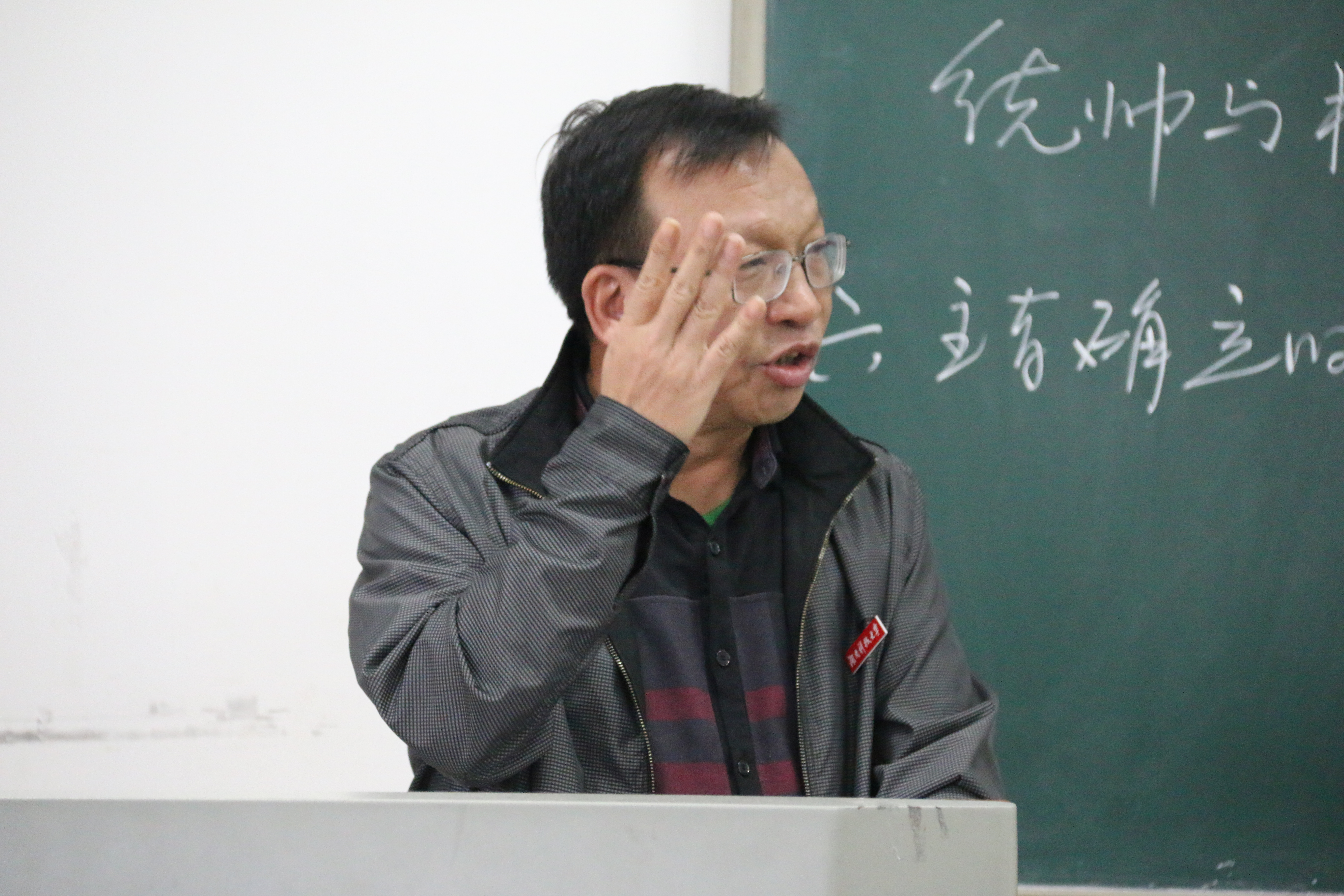 他俏皮地将眼镜托在额头上,极专注地在黑板上列出上课的知识要点,写下与相关的古人名言。这是汉语言文学专业正在上基础写作课的张学知老师。距离上课还有十多分钟,张学知老师就已经提前来到了教室,而同学们也很早赶到教室把前排坐满。上课铃响后,他先是讲解黑板上杜牧、王夫之、刘熙载等古人对文章主旨、结构、章句关系所持的观点,借此来展开文章主旨。而后他又讲解了主题、论题、课题、标题之间的联系和区别,他强调了议论文中的论证、论据与辩论赛中的论证、论据的差异,他说:“辩论赛中的论题都是中性论题,‘公说公有理,婆说婆有理’,好比‘老员工该不该谈恋爱’,这个论题想必大家都有充足的论证、论据去证明自己的观点吧?”同学们都笑了,“所以,议论文中的论证、论据与辩论赛中的论证、论据是不同的。”