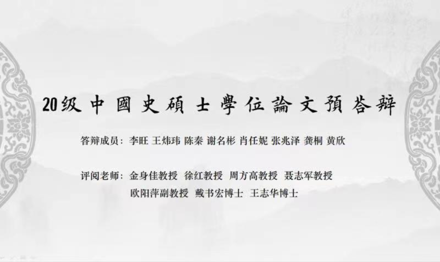 3月12日,2020级中国史1组硕士学位论文预答辩于立言楼B106如期举行。本次预答辩由徐红教授主持,金身佳教授、周方高教授、聂志军教授、欧阳萍副教授、戴书宏博士、王志华博士担任预答辩评委。