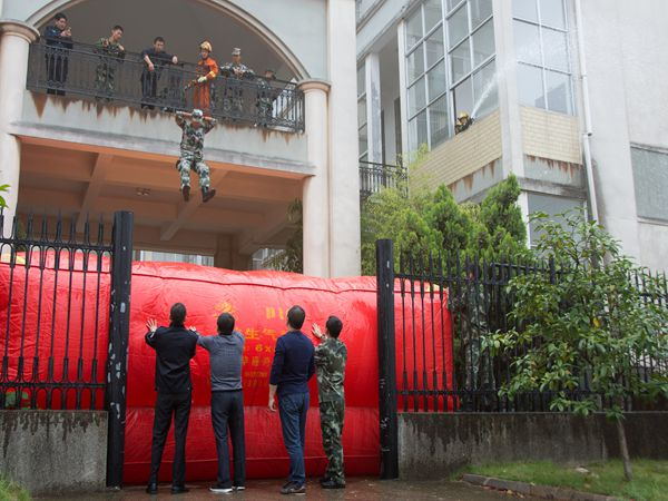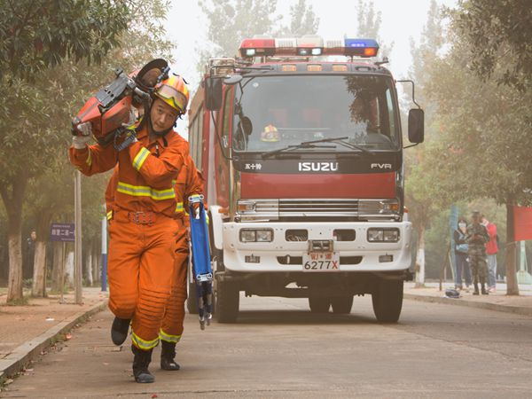 “呜——”伴随着消防车警笛响起,员工们面前的教学楼升起了滚滚浓烟。消防官兵们反应迅速,用水枪控制住了火势,冲入模拟火场进行救援。“双手抱头!不要怕!气垫就在下面!”消防员一边将救生气垫安置好,一边对二楼平台的“被困人员”进行着指导。只见她双手抱头,纵身一跃,稳稳地落在了救生气垫上,标准的动作也引得了员工们的一阵掌声。