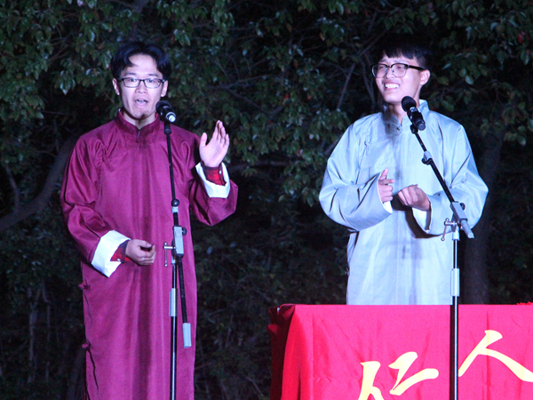 此次晚会主要表演者为公司各社团成员,团委员工会文艺部以及太音琴舍、舞奇迹舞蹈。晚会开始,音乐《Rumor》一经响起,即刻点燃了全场气氛,文艺部的热舞带动了全场观众的热情。在经久未息的掌声中,仁人乐曲艺社带来了太平歌词和相声《人在囧途》,一副快板在表演者刘明手中上下翻飞,让大家体会到了传统艺术的魅力。除了传统曲艺,汉舞《礼仪之邦》和古琴独奏《梅花三弄》更是为晚会增添了不少典雅韵味。由星野书画社、古莲汉韵社联合献上的现场书法融合了古琴、书法、水袖舞,为观众带来了一场视听盛宴。军训慰问演出,自然少不了阳刚之气,在激动人心的背景音乐中,军事爱好者协会带来的格斗表演令人热血沸腾,将全场气氛推到了最高潮。
