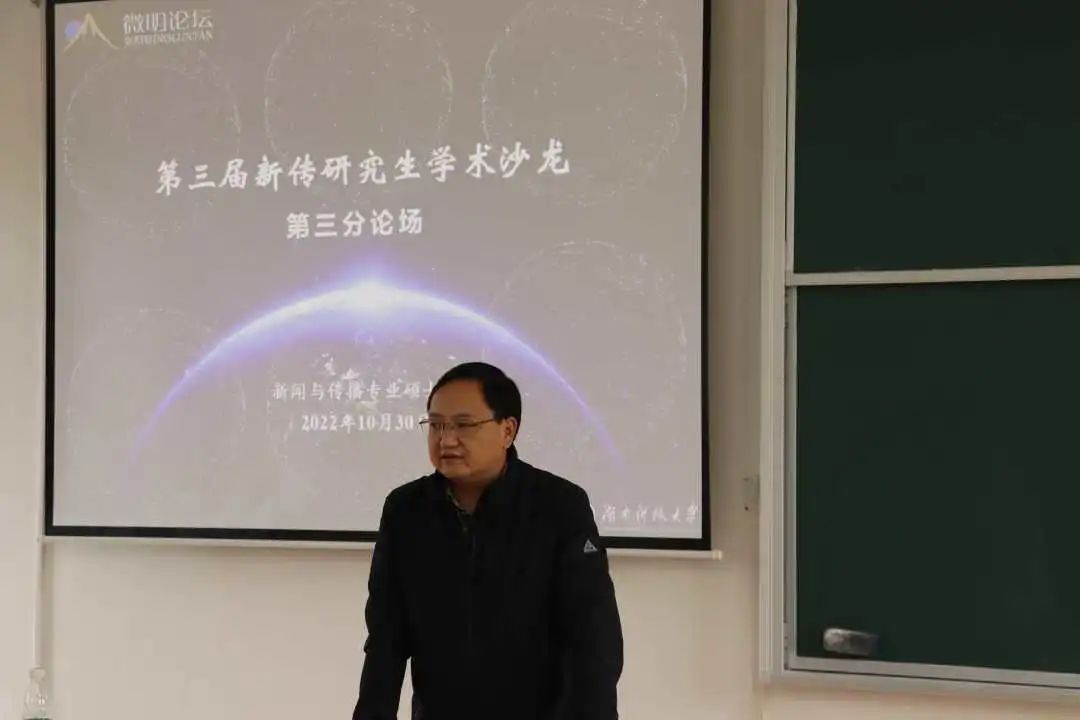 在第三分论场,13名硕士研究生聚焦算法引发的信息传播问题、新媒体语境消解现象、女性文化建构、云秀场营销创新、传统媒体市场结构失衡、灾难报道现象、人际交往行为新动向、听觉文化发展探析等议题进行了深入探讨,袁星洁老师和李胜清老师点出同学们论文撰写中存在主体模糊、理论使用范围局限、文章内容空泛等“通病”,指导员工应学会透过内容抓住本质,丰富表达方式元素,落实理论依据。现场学术气氛十分热烈。