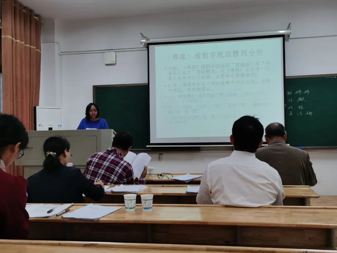 刘微汇报了题为《<英藏敦煌社会历史文献释录>1-19卷用字研究》的毕业论文。徐前师老师建议将标题重新编排得更加简洁,关于敦煌文献的研究价值,赖积船老师认为其校勘价值高于文字价值,行文上应体现批判讹误字的价值取向,不能引导人使用异体字、通假字。尹戴忠老师建议论文要体现“释录研究”的研究主体,并指出某些章节名和论文题目重合度高的问题。秦老师在关键词的编排问题上进行补充,提醒同学们注意论文写作中的研究重点。